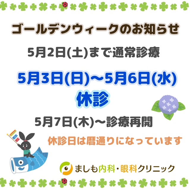 今年度も暦通りで、5月3日(日)〜5月6日(水)まで休診とさせていただきます。