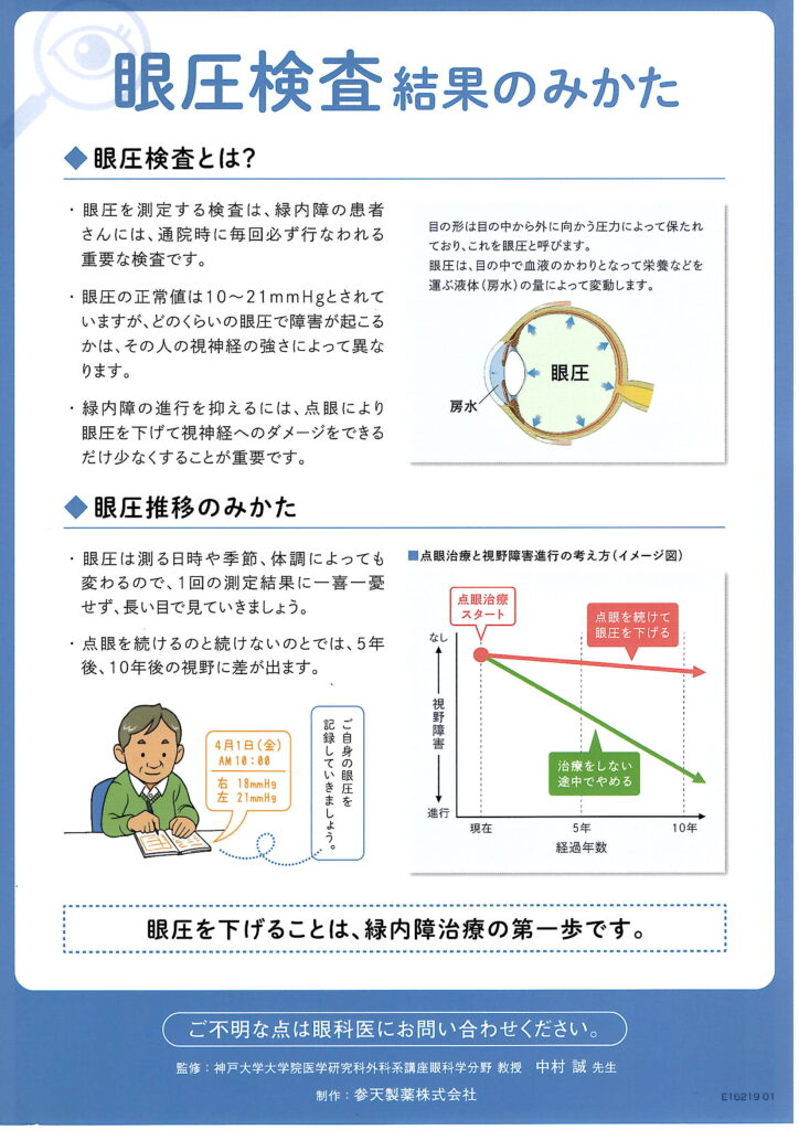 眼圧検査とは、眼球の硬さ(眼圧)を測定し、緑内障などの目の疾患を早期発見するための
