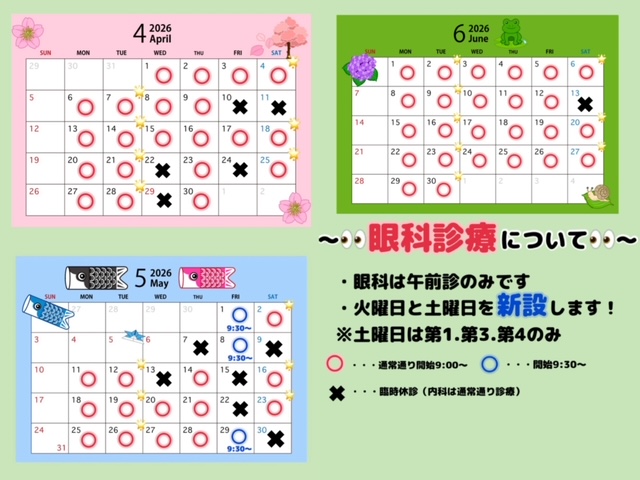 眼科のみ一部臨時休診の日もございますので、詳しくは画像をご確認ください!